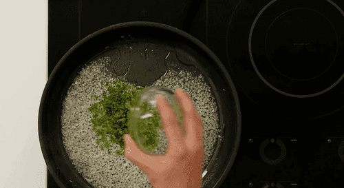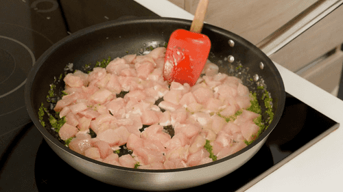 Затем добавить курицу, нарезанную кубиками, посолить. Готовить 6-8 минут до готовности курицы.