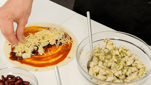 Тортилью смазать двумя столовыми ложками подготовленного соуса, выложить в линию фасоль, курицу, посыпать тертым сыром и завернуть в трубочку.
