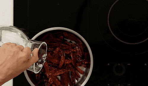 Сушеные перцы отправить в кастрюлю, залить 750 мл воды, добавить палочку корицы, довести до кипения, затем уменьшить огонь, накрыть крышкой и варить 30 минут. Затем слить воду в отдельную емкость (она еще пригодится).