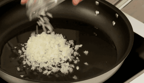 На сковороде разогреть растительное масло, обжарить 40 г измельченного лука до мягкости.
