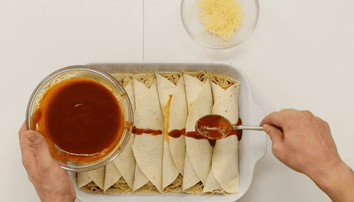 Так проделать со всеми лепешками, выложить их в подходящую форму, смазанную растительным маслом. Сверху полить соусом, посыпать тертым сыром и отправить в духовку, разогретую до 180 градусов, на 20 минут.