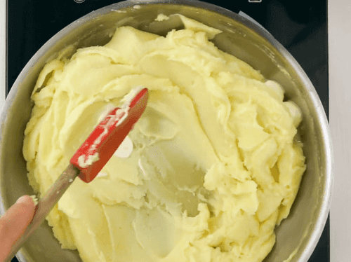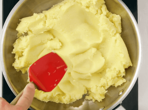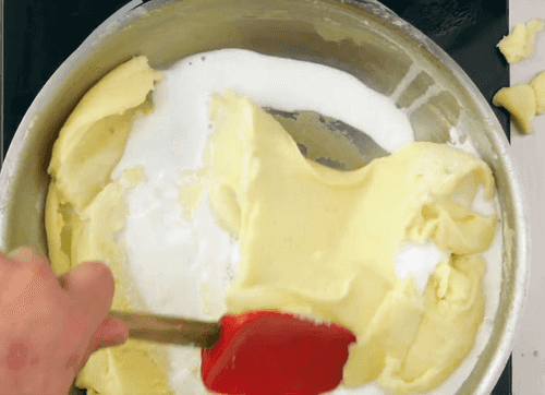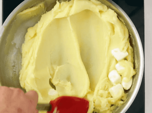 When all the butter is dissolved in the potatoes, remove the saucepan from heat and pour in the milk.