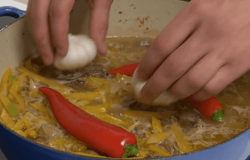 Положить в зирвак (так называется жидкая среда, которая образуется в казане) очищенные от верхней шелухи целые головки молодого чеснока и перцы чили. Томить все вместе тридцать минут.