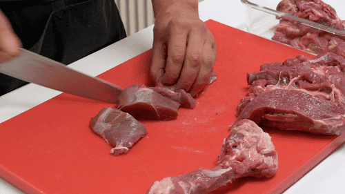 Баранину очистить от прожилок, пленок и жира — если невнимательно к этому отнестись, у мяса может быть неприятный дух. Снять мясо с кости. Кости нарубить удобными для манипуляций кусками, мясо — кубиками со стороной примерно три сантиметра.