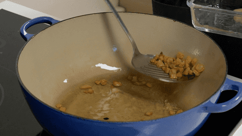 Нарезать курдючный жир — кубиками примерно того же размера, что мясо. Сложить его в горячий казан — курдюк станет пузыриться и плавиться, надо, не помешивая, дождаться, когда пузыри исчезнут, и тогда перевернуть слипшийся комок. Жир надо вытапливать на среднем огне, чтобы он получился прозрачным. Когда в казане останется только вытопленный жир и шкварки, вытащить их.