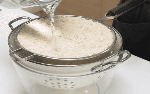 Промыть замоченный рис. Делать это надо осторожно: поставить миску под струю холодной воды и слегка наклонить, чтобы вода потихоньку стекала с одной стороны. Тереть рис нельзя, иначе он будет ломаться, лучше слегка подбрасывать в миске