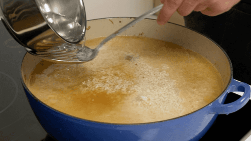 Вытащить из казана кости — если не убрать их до того, как засыпать рис, они замедлят варку и рядом с каждой образуется комок недоваренного риса, который по зернышку будет попадаться в каждой ложке.