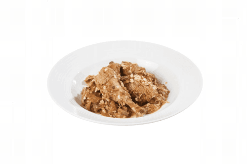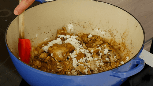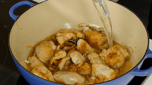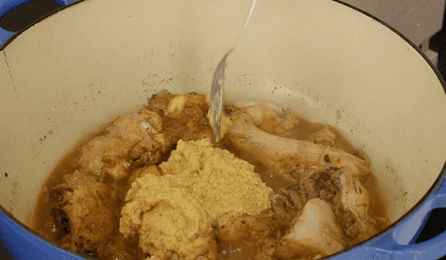 Add 70 ml of water to the mortar, mix the contents, and pour it into the pot with the chicken.