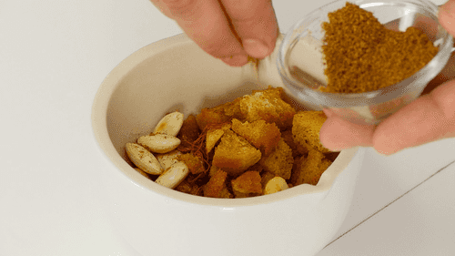 In a mortar, crush roasted garlic and bread with almonds, saffron, cumin, and yolks of boiled eggs.