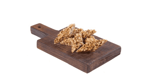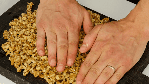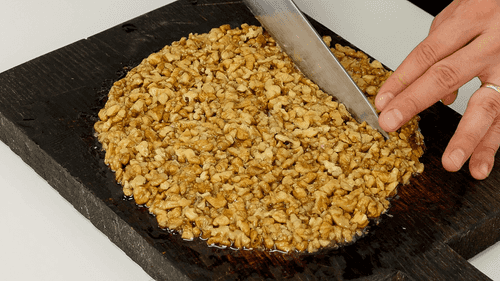 Орехово-медовую массу выложить на деревянную доску и сформовать лепешку толщиной около 1,5 сантиметров. Карамель очень горячая, поэтому необходимо смачивать руки ледяной водой, чтобы не обжечься.