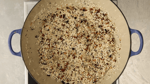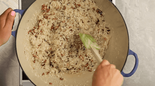 Pour rice into the pot and fry it with onions over high heat for five minutes.
