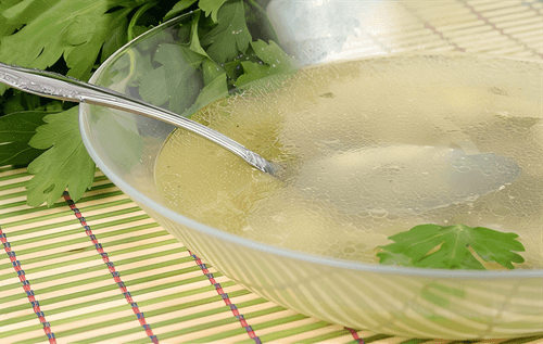 Продолжительность варки прозрачного бульона — от 2 до 2,5 часов. Готовое мясо вынуть и использовать для приготовления второго блюда. После того как бульон отстоится, снять сверху жир и процедить бульон сквозь частое сито или салфетку.