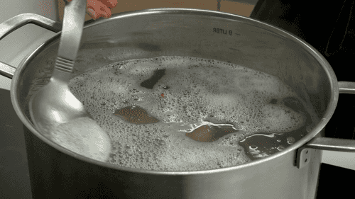 Когда вода закипит, убавить огонь и снять образовавшуюся пену. Варить бульон без крышки на небольшом огне 1 час.