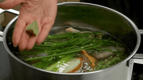 Добавить в бульон лук, морковь, сельдерей, стебли петрушки и укропа, тимьян, душистый и черный перцы, лавровый лист. Варить без крышки также на небольшом огне 2–3 часа.
