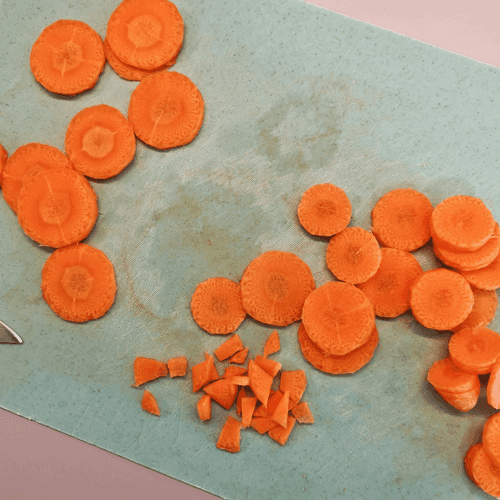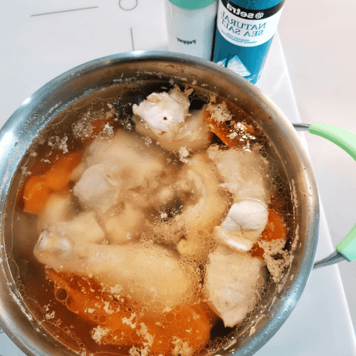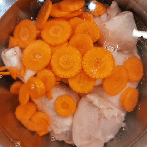 Выложить курицу и морковь в кастрюлю и залить питьевой водой до отметки в 2 литра. Поставить на сильный огонь.
