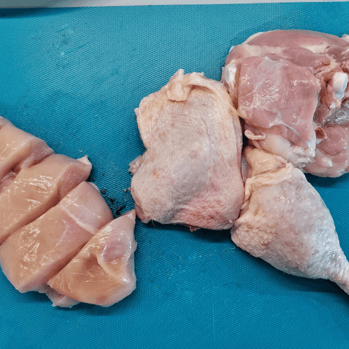 Филе грудки нарезать крупными брусочками. Ножку и бедро оставить неизменными.