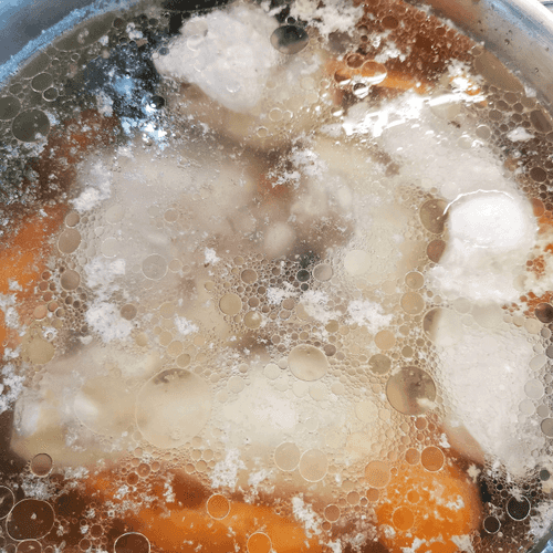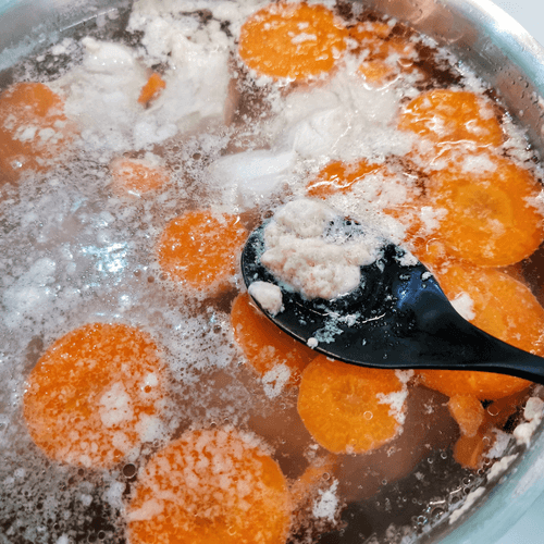 После того, как вода закипит, убавить огонь, снять ложкой образовавшуюся пену.