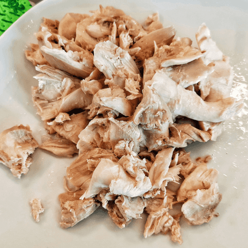 Курицу из бульона выложить и немного охладить. Затем разделить руками на волокна.