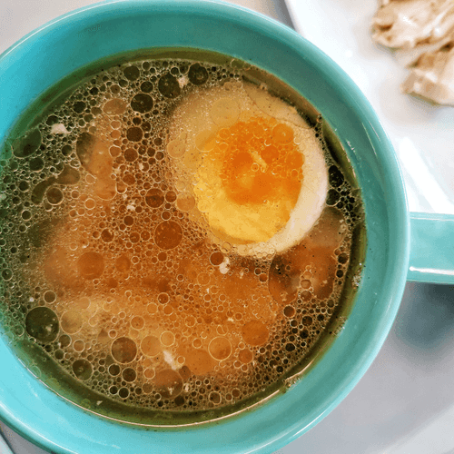 Отправить курочку обратно в бульон. Подавая суп, добавить яйцо и посолить.