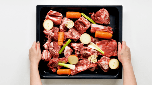 На противень выложить овощи и суповой набор и отправить в духовку, разогретую до 200 градусов, на 25–30 минут. Мясо должно покрыться румяной корочкой.