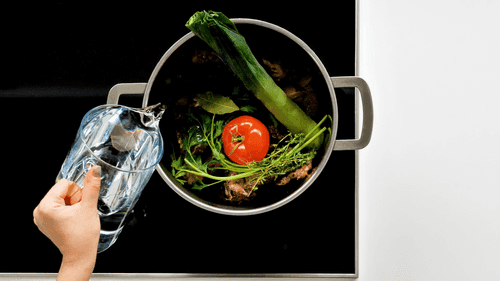 В кастрюлю налить холодную воду, выложить мясо и овощи из противня.