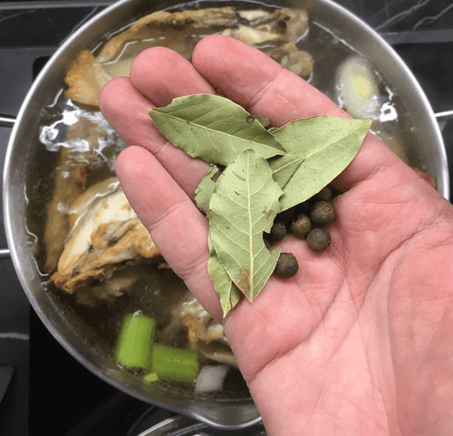 Добавить лавровый лист и душистый перец. Дать бульону закипеть и сразу же включить минимальный огонь (еле появляющиеся пузырьки) и томить 3 часа. Из-за запекания остовов пены не должно быть и цвет бульона будет золотистым.