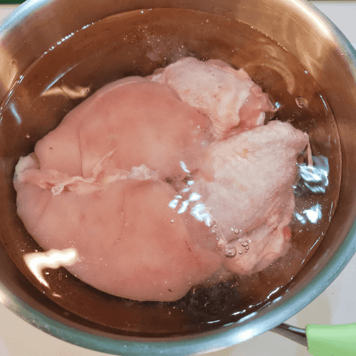 Курицу выложить в кастрюлю и залить водой. Поставить на сильный огонь.