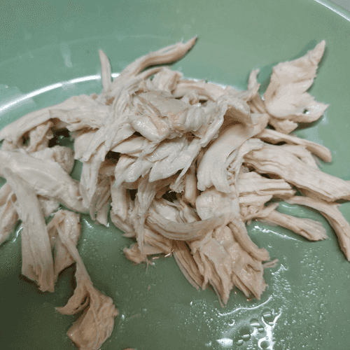 Изъять мясо из бульона, кастрюлю накрыть крышкой. Курицу остудить немного и разобрать на волокна. Затем снова объединить ингредиенты.