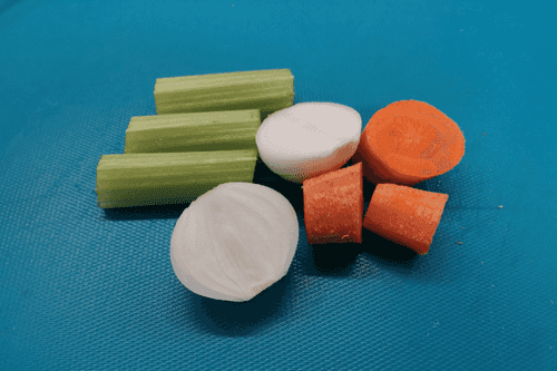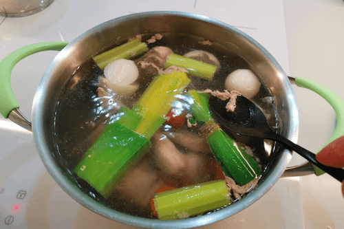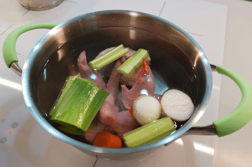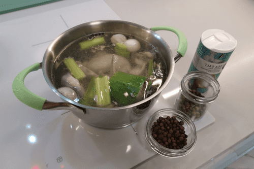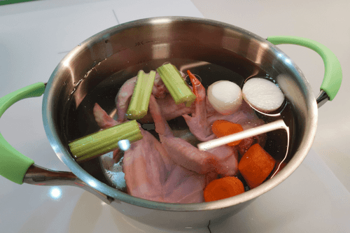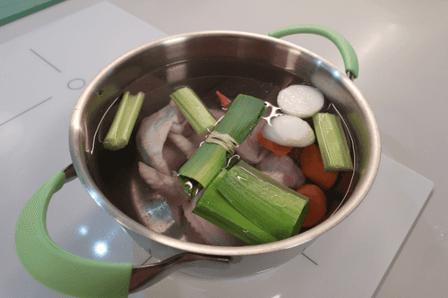 Положить в бульон букет гарни. Поставить на сильный огонь.