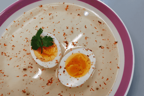 Готовый бульон перелить в суповую тарелку. Добавить яйцо, разрезанное пополам. Приправить молотым чили и подавать.
