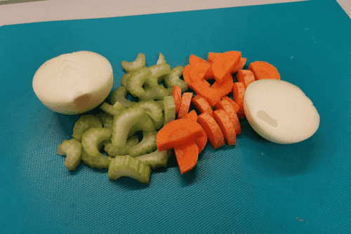 Некрупно нарезать овощи. Луковицу разрезать пополам.