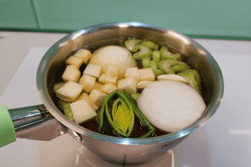 Выложить нарезанные овощи в кастрюлю и залить водой. Установить сильный огонь.