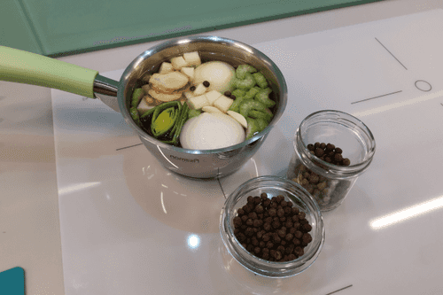 Добавить перец горошком, слайсированный имбирь и зубчик чеснока.