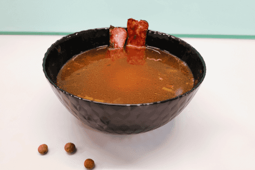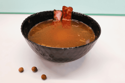 Острый говяжий бульон – это насыщенное и ароматное блюдо французской кухни, берущие корни в традиции создания сложных бульонов для изысканных соусов и супов. Его интенсивный мясной вкус дополняется пряными нотками букета гарни и пикантностью томатного сока с соусом чили. Медленное томление более трех часов придает бульону глубокий насыщенный вкус и шелковистую текстуру. Такой бульон можно использовать как основу для супов, соусов или подавать как самостоятельное согревающее блюдо, обогащенное кусочками обжаренного бекона. Идеально подходит для холодных вечеров, наполняя дом уютом и ароматами классической кулинарии.