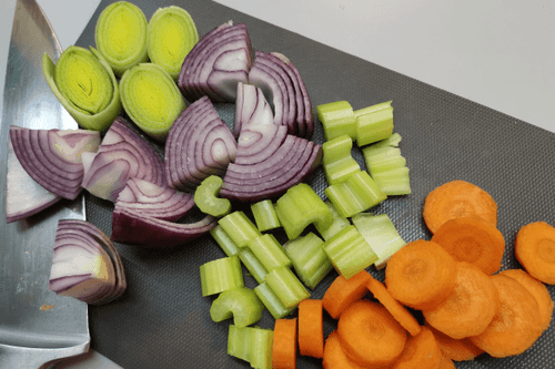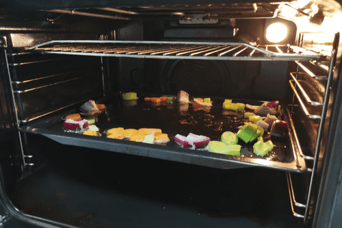 Обжаривать нарезанные овощи в вытопленном говяжьем жире 15 минут при температуре 200 градусов в духовке.