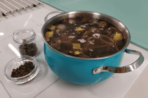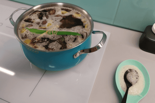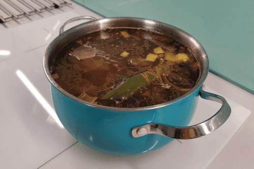 Залить основу для бульона водой и поставить на сильный огонь. После закипания огонь убавить.