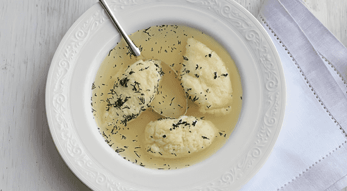 Мелко нарезать укроп. Процеженый бульон посолить и довести до кипения. Двумя мокрыми чайными ложками быстро опустить в не слишком бурно кипящий бульон небольшие клецки. Они варятся примерно 7 минут. Подавать бульон с клецками, посыпав укропом; отдельно поставить пиалу с кусочками цесарки, чтобы каждый добавлял себе в тарелку столько, сколько захочет.