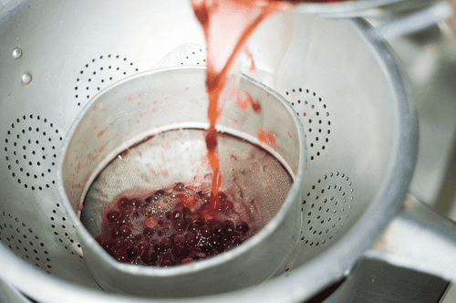 Процедить ягодный отвар, добавить в него изюм, отложив несколько изюминок, чтобы потом положить их в бутылки.