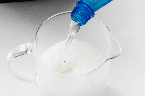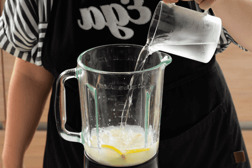 Добавить сгущенку. Налить воды без газа так, чтобы покрыть содержимое чаши. Взбить блендером в однородную массу.