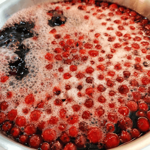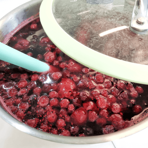 Снять крышку и размягчить ягоды ложкой о стенки кастрюли. Доварить еще около минуты.