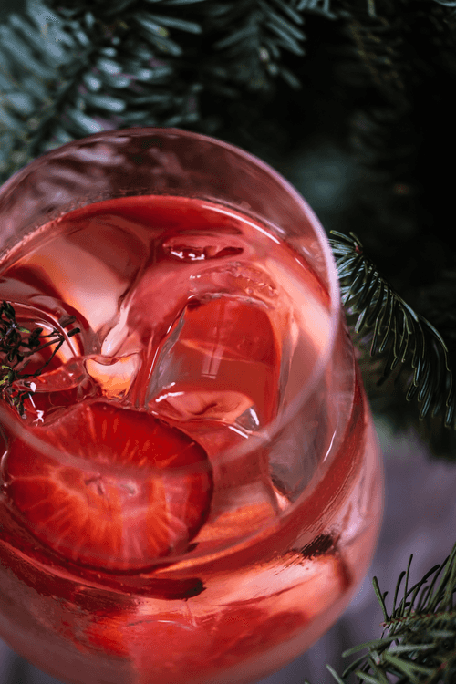В винный бокал положить слайсы клубники и грейпфрута, слой льда, снова добавить клубнику и грейпфрут, а также веточку тимьяна.