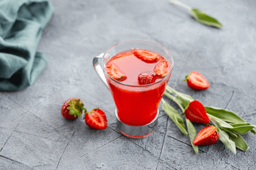 Процедить напиток через ситечко в бокал. Украсить слайсами клубники и свежим шалфеем.