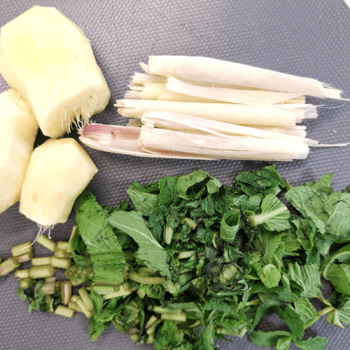 Мяту мелко нарезать, лемонграсс разобрать на волокна, имбирь очистить.