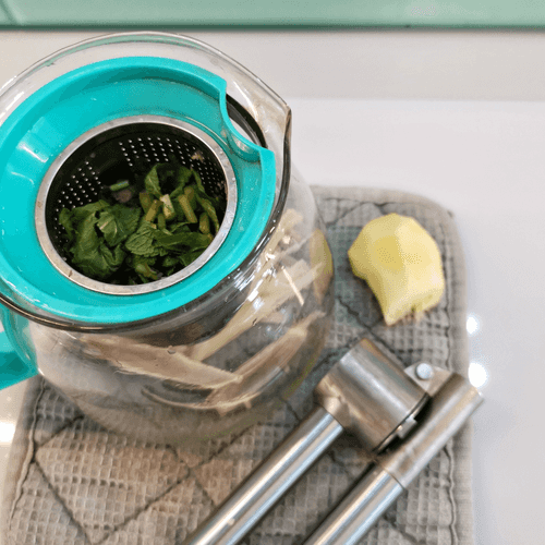 Отправить мяту и лемонграсс в заварочный чайник, сок имбиря выжать через пресс (жмых тоже добавить).