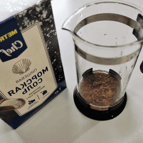 В молотый кофе добавить 3-4 крупинки крупной морской соли.