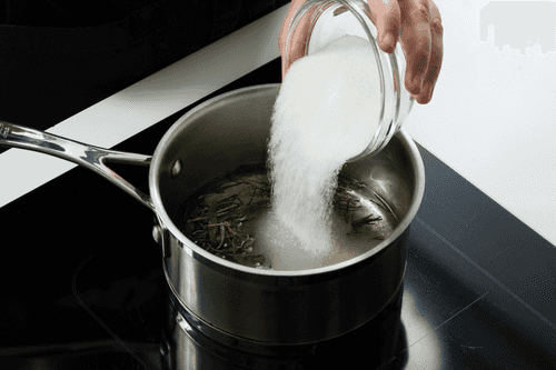 Разогреть 180 мл воды, добавить сахар и розмарин. Прогреть, размешивая, пока сахар полностью не растворится.