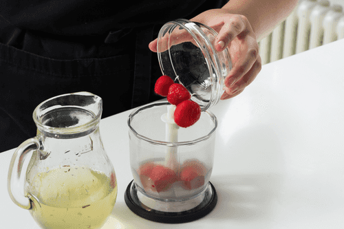 Измельчить в блендере половину ягод клубники с розмариновым сиропом.