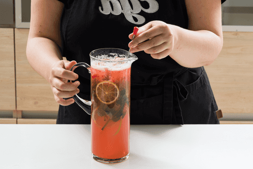 Переложить мяту в кувшин, добавить кружочки лайма и клубничное пюре.