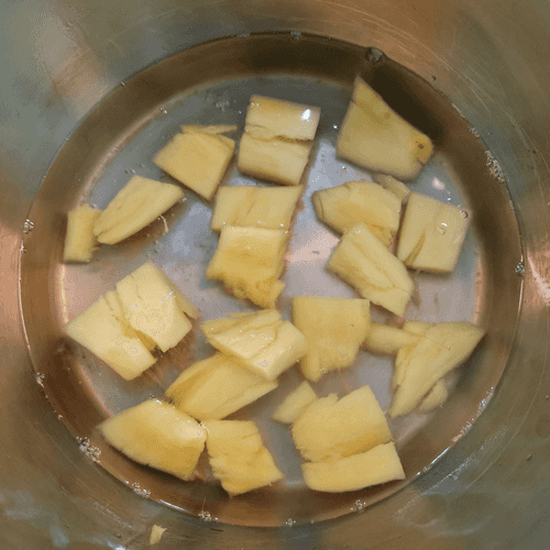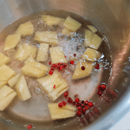 Выложить имбирь в кастрюлю, долить 1/3 стакана воды и поставить на сильный огонь.