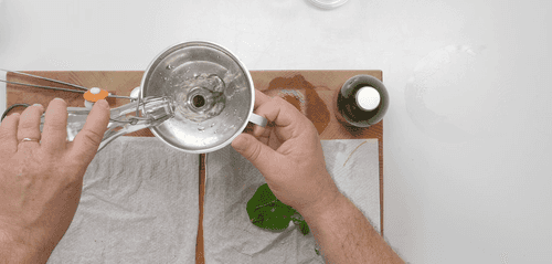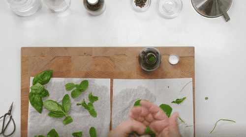Положить листья базилика на одну руку и прихлопнуть их второй. Это нужно для того, чтобы слегка разрушить структуру листьев — так они отдадут больше сока.
